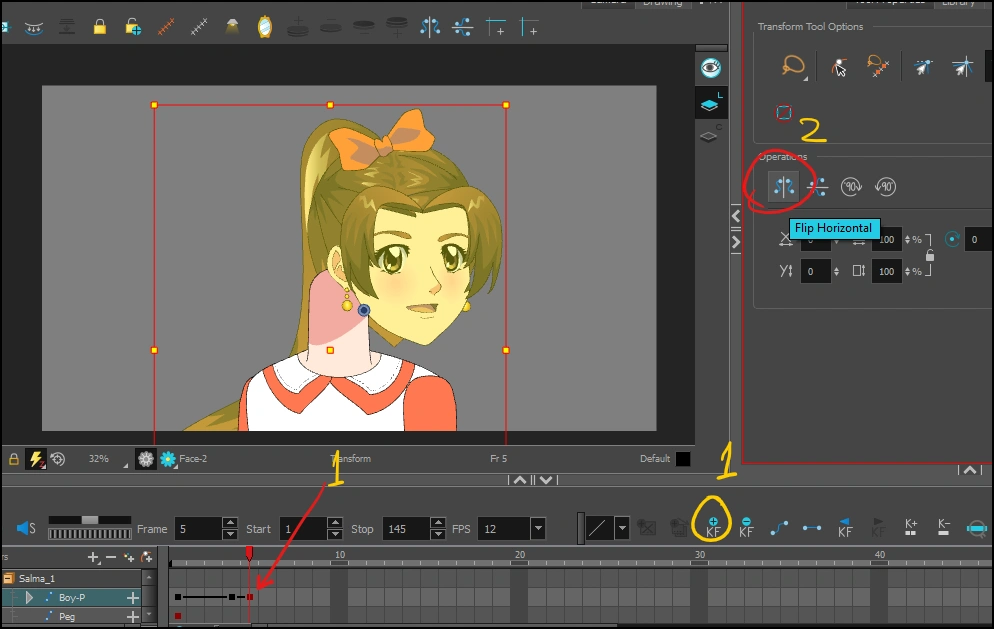 - عبر أداة Transform Tool نقوم بقلب الوجه، والخيار الذي يقلب الوجه موجود في القائمة اليمنى وهو Flip Horizontal، وقد حددته لكم بالدائرة الحمراء.